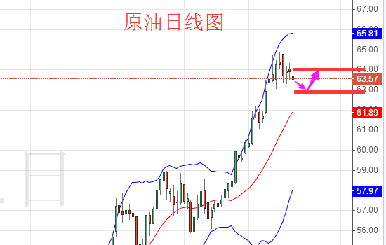 原油從日線圖可以看到,自原油價(jià)格從55.8低點(diǎn)持續(xù)上漲后一度到達(dá)64.83一線的高位,上周原油連續(xù)三日收陰線。技術(shù)指標(biāo)上,布林帶微縮口,K線運(yùn)行于布林帶中上軌之間,MA5、MA10開始向下拐頭,附圖指標(biāo)MACD紅色多頭能量柱開始背離,DIF有下穿DEA形成死叉的跡象,表明現(xiàn)在原油整體處于空頭趨勢(shì),短期內(nèi)有繼續(xù)回落整理的跡象,未來價(jià)格有望到62一線。