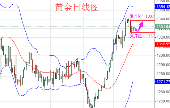 另一方面從4小時(shí)線上來看,黃金弱勢(shì)下,目前處于一個(gè)關(guān)鍵位置布林中軌也是短期的多空分水嶺,一旦跌破,那么金價(jià)將會(huì)再度回調(diào)至1325一線,反之回調(diào)結(jié)束,并確立下方支撐,繼續(xù)上行。綜合來看強(qiáng)勢(shì)行情的中的回調(diào),只要不出現(xiàn)連續(xù)性破低,就很容易形成雙底支撐。下方重點(diǎn)看1325的支撐,不破偏強(qiáng)整理,回調(diào)幅度有限,而上方1338壓力位,一旦突破行情或?qū)⒗^續(xù)走強(qiáng)。