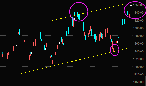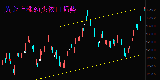 日線圖來看,隔夜金價強勢突破去年9月高位1357美元,且一度上探1361美元,最高到達1365.95,這暗示了進一步的上行空間已經(jīng)打開。今日開盤,金價再度刷新高位。