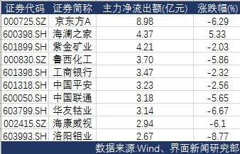主力凈流出額超1億元的個(gè)股達(dá)69只,京東方A(000725.SZ)、海瀾之家(600398.SH)、紫金礦業(yè)(601899.SH)主力凈流出較多,其凈流出額分別為8.8億元、4.37億元、4.21億元。此外,工商銀行(601398.SH)、中國(guó)平安(601318.SH)等個(gè)股亦分別凈流出3.47億元、3.23億元。