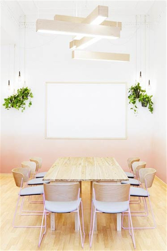 \u00A0蔚藍色給人天空的遙遠明亮,而它漸變的方式也是斜線暈染漸變,背景墻前的幾株植物仿若開在畫中的錯覺。