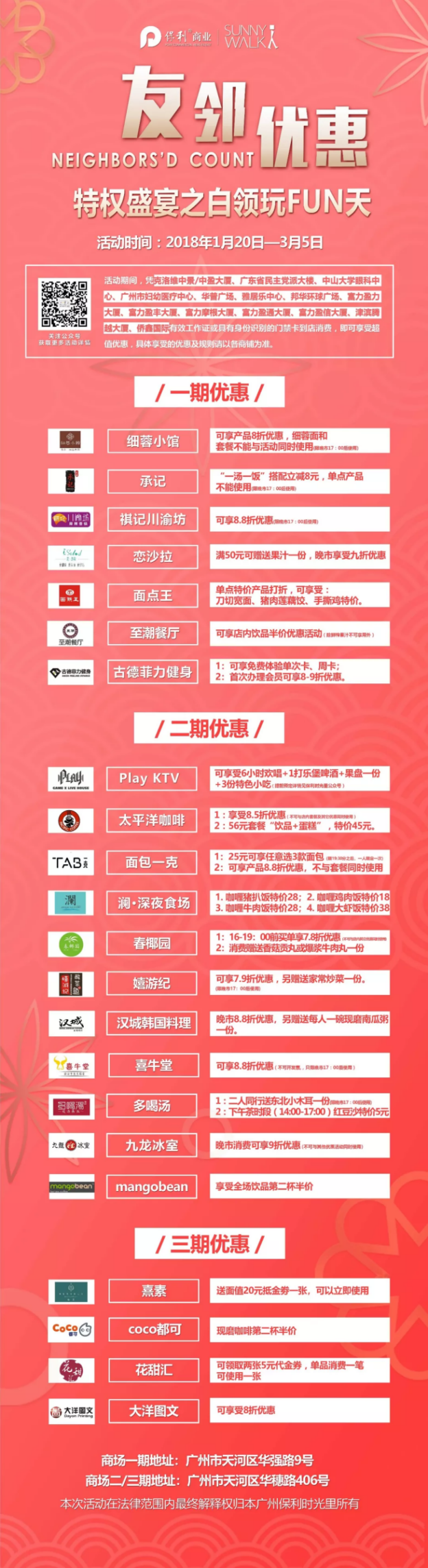 除了一系列話題性現(xiàn)場活動外,作為一個商業(yè)體量不到3萬方的商場,保利時光里可以說“麻雀雖小,五臟俱全”,滿足白領(lǐng)顧客消費者的吃喝玩樂購等多種需求。業(yè)態(tài)豐富飽滿的保利時光里在1月20日至3月5月專為樓上克洛維中景/中盈大廈及周邊寫字樓區(qū)域:廣東省民主黨派大樓、中山大學(xué)眼科中心、廣州市婦幼醫(yī)療中心、華普廣場、雅居樂中心、邦華環(huán)球廣場、富力盈力大廈、富力盈豐大廈、富力摩根大廈、富力盈通大廈、富力盈信大廈、津濱騰越大廈、僑鑫國際推出了特權(quán)盛宴之白領(lǐng)玩FUN天友鄰優(yōu)惠活動,集合了一二三期多個商鋪推出大力度優(yōu)惠折扣,當(dāng)中一期商鋪全國連鎖老字號品牌面點王更是推出了全天日單品六折活動;二期走文藝范的Play KTV更是全新內(nèi)部裝修調(diào)整以花海主題全新面貌出現(xiàn),白領(lǐng)顧客憑工作證提前預(yù)定可免費享受6小時歡唱+1打樂堡啤酒+果盤一份+3份特色小吃等;如此吃喝玩樂集一地的保利時光里讓你流連忘返。