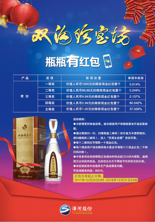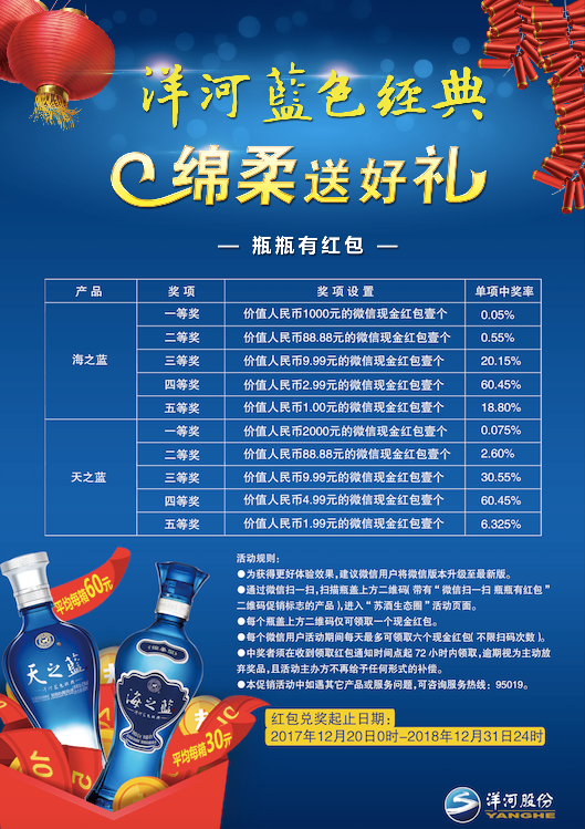 從現(xiàn)在開始,消費(fèi)者購買促銷裝的洋河海之藍(lán)、天之藍(lán)以及雙溝珍寶坊君坊產(chǎn)品即可參與“瓶瓶有紅包”活動,中獎率高達(dá)100%,最高2000元!