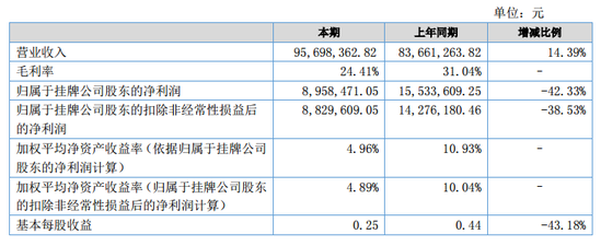 而根據(jù)其2017半年度報告顯示,報告期內,公司實現(xiàn)營業(yè)收入9570萬元,比去年同期増加14.39%;但歸屬于掛牌公司股東的凈利潤896萬元,比去年同期下降42.33%;