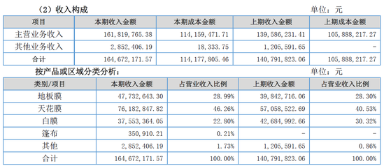 億邦動力網了解到,龍威新材料的營業(yè)收入基本來自于主營業(yè)務收入,報告期內收入16182萬。主打產品仍為天花膜系列產品、地板膜系列產品及白膜系列產品,篷布系2016年開發(fā)的新產品,報告期內收入額為35萬,占比0.21%。
