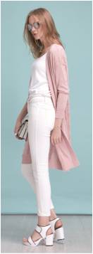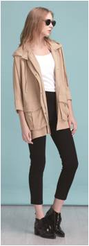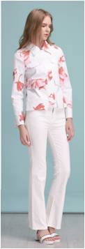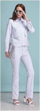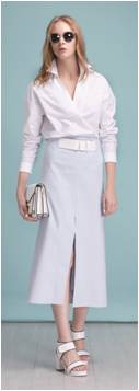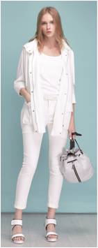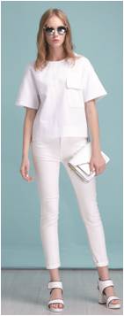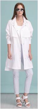 設(shè)計(jì)師從軍裝中得到靈感,運(yùn)用大而實(shí)用的口袋為元素,結(jié)合質(zhì)感挺括的面料,演繹出利落率性的女性形象;創(chuàng)新運(yùn)用柔和的水藍(lán)色和清爽的白色,碰撞出春日感覺。七分袖水藍(lán)色暗紋短款單衫,搭配略寬松的白色9分長(zhǎng)褲,露出的腳踝拉長(zhǎng)視線,更顯高挑身材。加長(zhǎng)的A字裙型,搭配女性化斜襟襯衣,腰間巧妙設(shè)計(jì)的貫穿式款腰帶,優(yōu)化身材比例,凝練出干練利落的女性魅力。外搭白色風(fēng)衣,100%提升灑脫氣場(chǎng)。