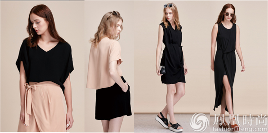 摩登希臘這一系列設(shè)計師的靈感來自希臘的翩翩垂墜,純粹而摩登的演繹。同色系的選擇,更能發(fā)揮精致和飄逸面料在不同設(shè)計下帶來的精彩表現(xiàn)。希臘式的摩登,是透著一點小性感的典雅。黑色蝙蝠款T恤搭配深卡其色裙褲,腰間的褶皺和綁帶是設(shè)計的重點。腰帶亦是此系列設(shè)計的點睛之筆,同樣的黑色裙裝,運用不同的腰帶或者獨特的綁帶方式,使同款衣服變得立體而富于變化。黑色短款連衣裙,由肩而至裙底邊的褶皺,在細細腰帶的牽引下形成獨特的下擺。黑色側(cè)開口長款連衣裙,綁帶設(shè)計展現(xiàn)出女性的腰部曲線,綁帶下沿側(cè)開口的手法則創(chuàng)造出了大長腿的即視感。率性而摩登。