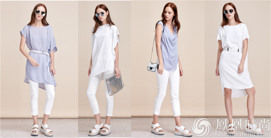 希臘風(fēng)格的設(shè)計,運用飄逸及褶皺打造出了整體舒適慵懶的感覺,是夏日里咖啡時間穿著的最佳選擇。輕薄的紗質(zhì)和雪紡面料,最大化的體現(xiàn)出設(shè)計師想要表達的垂順與清爽。寬松的上裝,不對稱的肩部設(shè)計。與上裝的立體和變化相呼應(yīng),下裝一條簡潔的白色7分緊腿褲,便能輕松get經(jīng)典搭配。