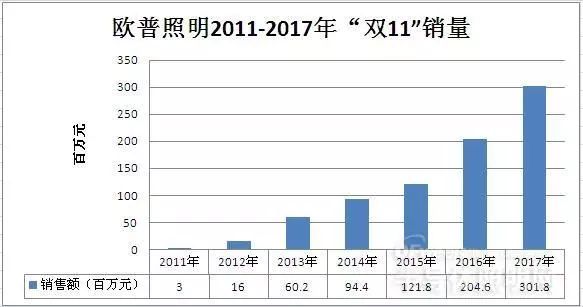2017年“雙十一”當(dāng)天實(shí)現(xiàn)3億元銷售額,連續(xù)五年在照明家裝行業(yè)排首位,全年電商收入占比達(dá)到20%以上。由此可見,近幾年,線上電商已經(jīng)成為歐普照明的重要銷售渠道,一個(gè)一個(gè)臺(tái)階的高速業(yè)績(jī)?cè)鲩L(zhǎng),使電商業(yè)務(wù)已成為拉動(dòng)歐普照明業(yè)績(jī)高速發(fā)展的重要增長(zhǎng)極。