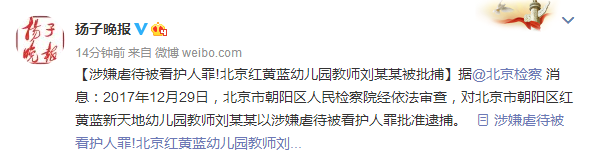 【涉嫌虐待被看護人罪!北京紅黃藍幼兒園教師劉某某被批捕】據(jù)@北京檢察\u00A0消息:2017年12月29日,北京市朝陽區(qū)人民檢察院經(jīng)依法審查,對北京市朝陽區(qū)紅黃藍新天地幼兒園教師劉某某以涉嫌虐待被看護人罪批準逮捕。