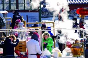 頤和園冰場(chǎng)邊上,熱氣騰騰的熱飲熱食攤兒,讓風(fēng)寒中的游客看著就想湊過(guò)去。龐錚錚/攝
