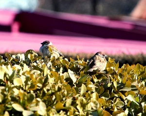 長(zhǎng)安街旁,一對(duì)麻雀站在灌木叢,享受正午的太陽(yáng)。 王新/攝
