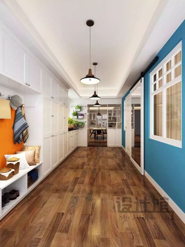 ▲以白色與藍(lán)色相對的背景色,在換鞋凳下方留空出臨時存放鞋子的空間,而后方的墻面加入橙色的沖撞,突出其活潑的現(xiàn)代風(fēng);進(jìn)門后左手邊處的設(shè)計(jì),以大面積的收納儲物柜,一進(jìn)門就是個豐富實(shí)用的鞋柜,可以收納鞋柜、雨傘、包包,重要的是可以收納男主人經(jīng)常出差所用的行李箱;同時在靠窗的位置留空出一個擺放植物的小臺面,這與女主人強(qiáng)調(diào)的需求設(shè)計(jì)不謀而合。