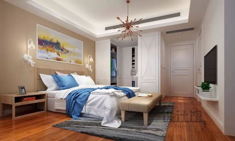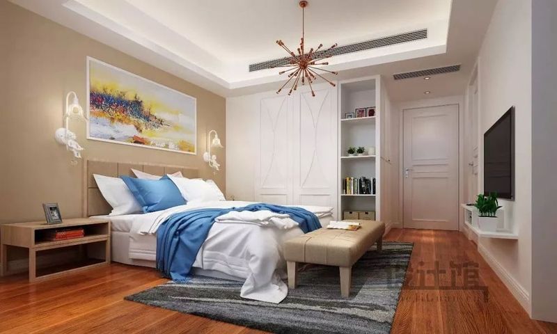 ▲木質(zhì)地板加置毛呢地毯裝飾,不僅美觀,更有防滑防濕的作用;床尾處的壁掛式電視機(jī),前方還裝了一塊擱板擺置機(jī)頂盒與綠植,為臥室?guī)砹艘唤z絲的清新愜意。