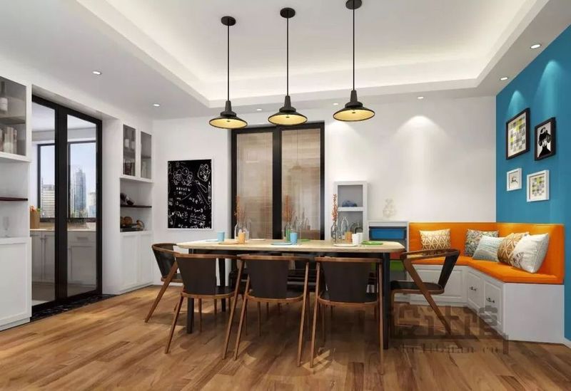 ▲考慮到餐廳餐廳的面積過大,而女主人正好有需要一個陪伴兒子讀書寫作業(yè)的小空間,所以就在餐廳角落裝了一個L型卡座;以海藍(lán)色的背景墻面,掛上畫作搭配橙色的卡座座椅,與玄關(guān)完美戶型,同時也與周圍的大白色墻面形成對比。黑色吊燈灑下昏黃色色的光照在大理石紋餐桌上,木質(zhì)餐椅與地板融合,白色陳列柜擺上書,彰顯主人高雅的氣質(zhì)。