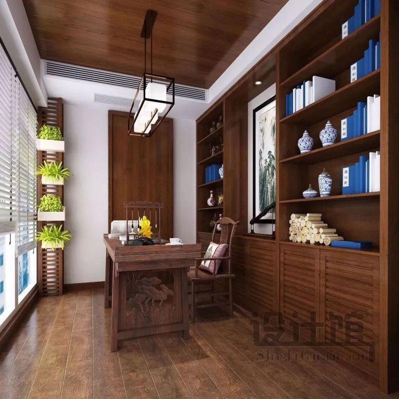 ▲女主跟設(shè)計(jì)師說:男主人喜歡書法,而且因?yàn)橹暗姆孔記]有給他一個獨(dú)立的書房,所以在現(xiàn)在的新房子里想給他留一個可以讓他放松、偶爾練練書法、偶爾辦辦公,看個書的書房,因此設(shè)計(jì)師選擇了主臥的陽臺,大面積的落地窗,視野開闊,在木質(zhì)與中式風(fēng)格的基礎(chǔ)下,結(jié)合角落的綠植點(diǎn)綴,營造出滿室書香氣息。