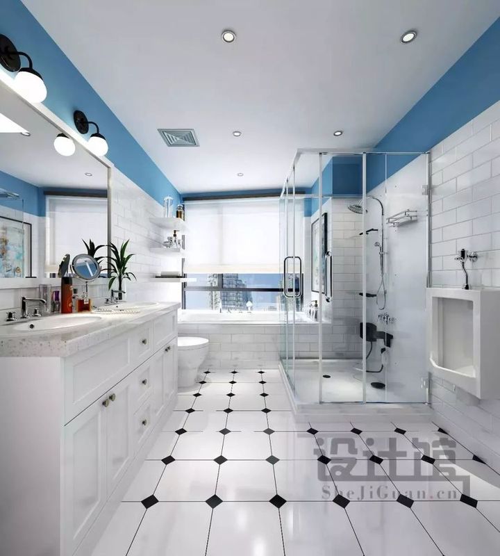 ▲明亮空曠的衛(wèi)生間,給人煥然一新的清新感。白色為主的地磚,以白色小黑磚點(diǎn)綴裝飾、清一色的純白柜子,搭配透明玻璃浴室,干濕分離。墻面則是鋪貼北歐風(fēng)格的白色小面包磚+頂部的藍(lán)色乳膠漆搭配;靠窗還裝了個大浴缸,讓忙碌了一天的主人們可以得到身心放松;然后還特意裝了個尿斗,因?yàn)檫@個主衛(wèi)是女主、男主人與兒子使用,有個尿斗可以方便男士們小便,從而避免了一些衛(wèi)生問題。