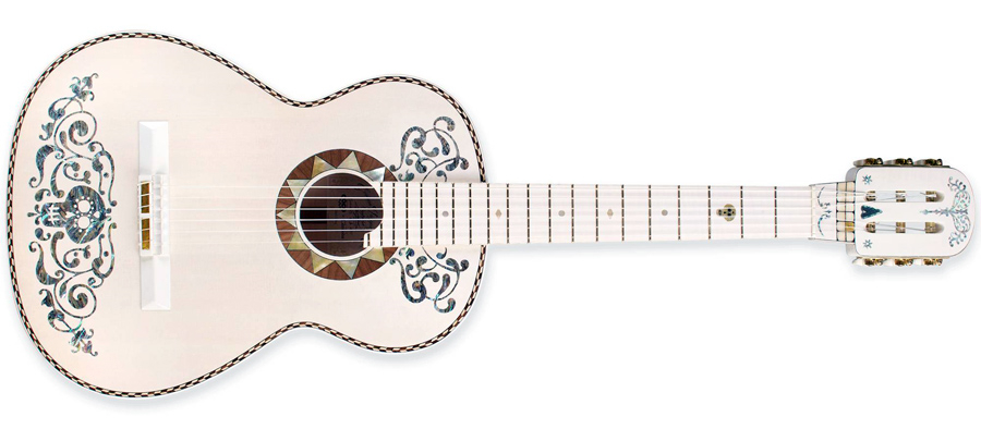 在整個影片中Miguel的吉他始終貫穿其中,這也是Miguel偶像Ernesto de la Cruz使用的吉他,它是一支白色的帶有骷髏形琴頭并在琴身上雕滿神秘花紋的吉他。