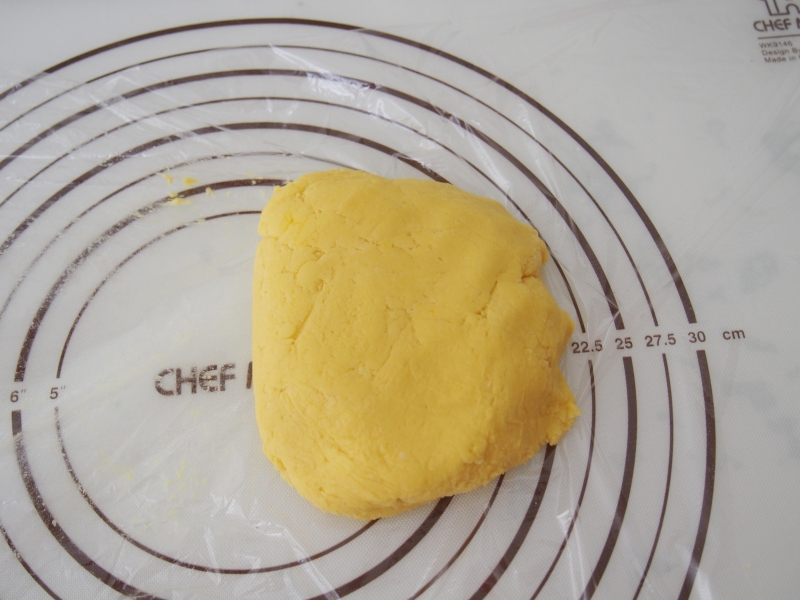 切拌成面團(tuán),放在保鮮膜上。