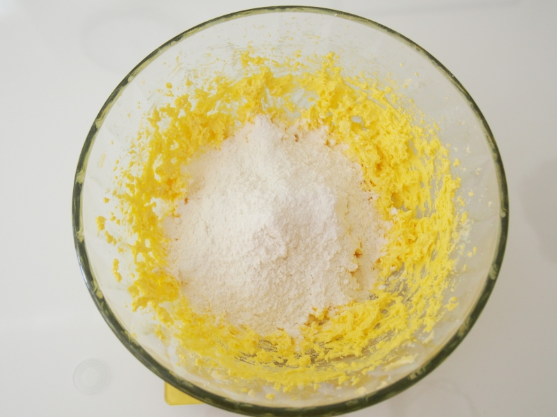 黃油軟化后加入細(xì)砂糖打發(fā),分三次加入打散的雞蛋,攪打均勻。篩入低筋面粉和泡打粉。