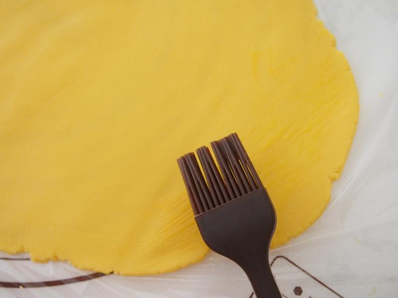 將面團(tuán)搟開,刷上一層蛋液。