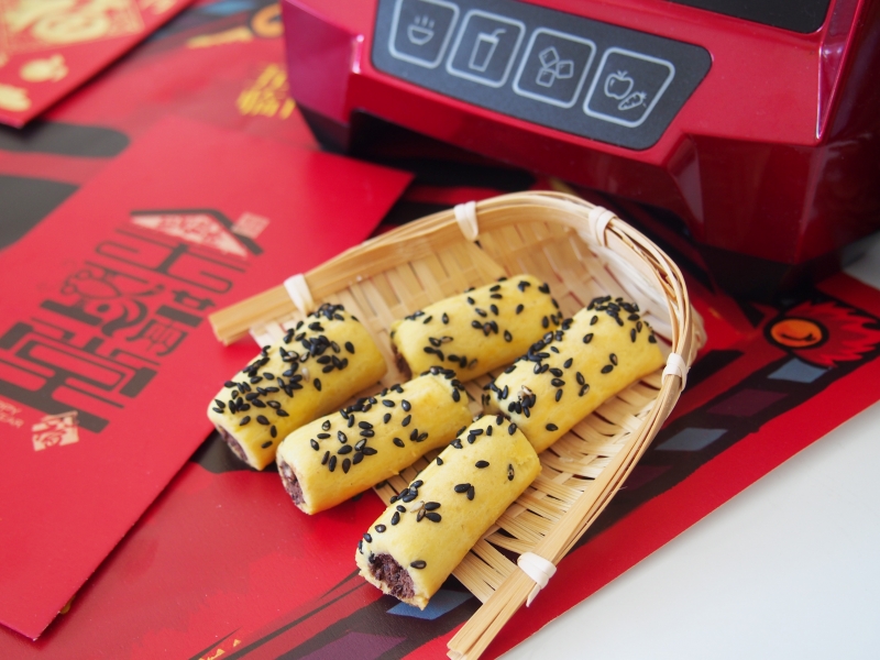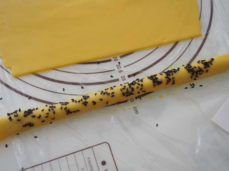 稍微揉一下,讓豆沙和面皮貼合更緊密。刷上一層蛋液,撒上一層黑芝麻。