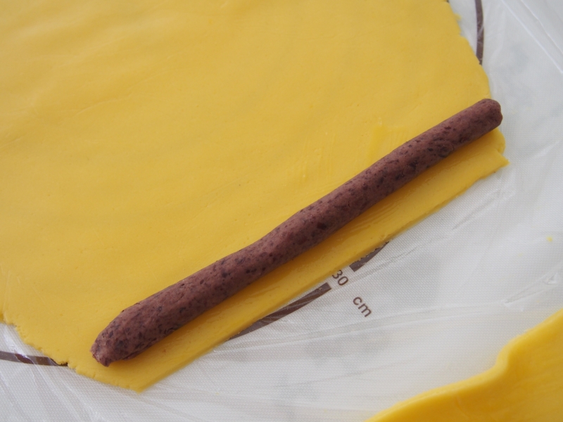將紅豆沙搓成條,放到面皮上裹起來(lái)。