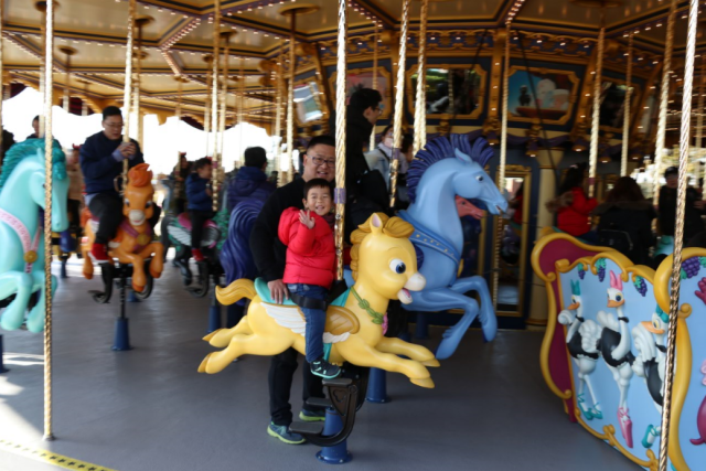今天的第一個(gè)項(xiàng)目就是非常經(jīng)典的旋轉(zhuǎn)木馬,原本以為這只是女孩子才喜歡的游戲,沒想到小男孩也同樣經(jīng)不住誘惑。大約要排隊(duì)30分鐘,很認(rèn)命的抱著兒子加入了排隊(duì)人潮。不過看著兒子坐在小飛馬上笑的如此開心,排長隊(duì)的勞累感立馬一掃而光。