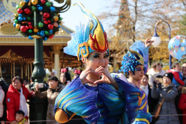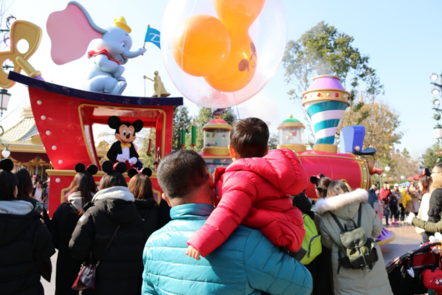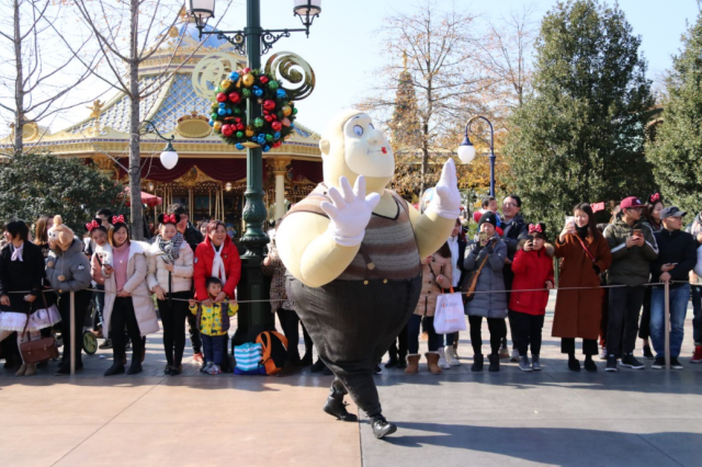 吃好飯出來,非常幸運(yùn)的趕上米奇童話專列花車巡游,帶著兒子看我小時(shí)候看過的動(dòng)畫人物,有一種穿越的感覺。米奇、唐老鴨在火車頭駕駛列車,而緊隨其后的夢(mèng)幻花車均取材自迪士尼經(jīng)典電影。