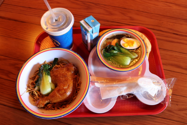 因?yàn)樵缟掀鸷茉纾芸靸鹤泳宛I了,我們決定先去覓食。憑感覺來到了這家“米奇好伙伴美味集市”,還沒到飯點(diǎn),所以人也不是很多。我點(diǎn)了一份雞腿面和一份兒童套餐,花了123元,味道一般。景區(qū)內(nèi)的飲食不能要求太高,餐廳內(nèi)在播放經(jīng)典的迪士尼動(dòng)畫片,哄孩子吃飯不用愁了。