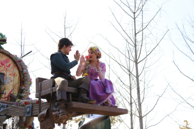 接下來是長發(fā)公主夫婦隆重登場(chǎng)。花車上的啤酒杯、餐盤什么的都會(huì)動(dòng),活靈活現(xiàn)。花車前是小鴨子酒館的人員,造型非常可愛,眼睛還會(huì)轉(zhuǎn)來轉(zhuǎn)去,兒子非常喜歡他。