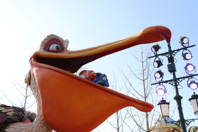 海底總動(dòng)員花車人物非常多,車頭是鵜鶘奈杰爾,他的大嘴里是健忘的藍(lán)唐王魚多莉和小丑魚馬琳,后面則跟著尼莫和它的小伙伴們。其中有個(gè)姑娘還朝我比了一顆心,還好孩子?jì)尣辉冢揖托廊唤邮芰税伞?/p>
