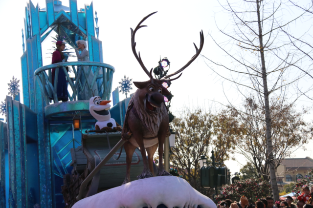 冰雪奇緣花車應(yīng)該是人氣最高的一輛,馴鹿拉著雪寶,愛莎和安娜位于冰雪城堡上,音樂也配合得十分完美,旁邊的妹子們不少都是跟著這輛花車移動(dòng)。