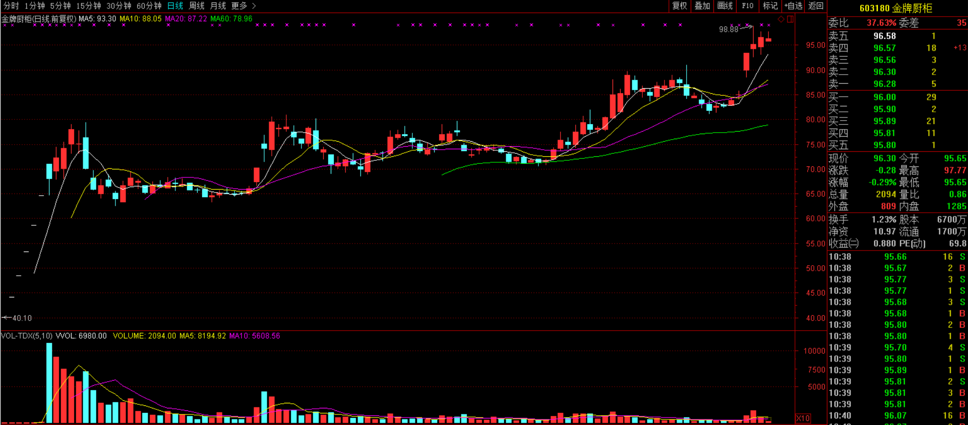 自從金牌櫥柜上市以來,我們就一直堅(jiān)持力推,隨著邏輯的逐步兌現(xiàn),我們的收益也隨之水漲船高。而隨著從股價(jià)6字頭開始介入,到現(xiàn)在接近100元,金牌本年的行情也進(jìn)入了收尾環(huán)節(jié)。
