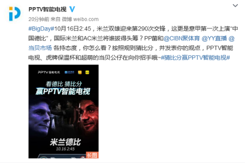 與此同時,10月13日,PPTV智能電視官方微博還聯(lián)手聚體育、當(dāng)貝市場等藍(lán)V同步發(fā)起了#猜比分送電視,暢談對大賽期待#的互動話題活動,在線上引發(fā)了廣大球迷對這場焦點(diǎn)賽事的持續(xù)關(guān)注。