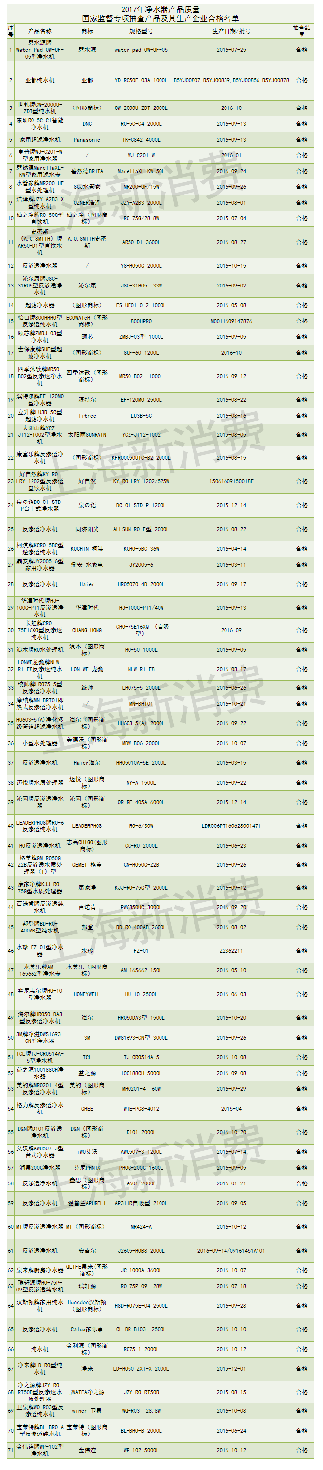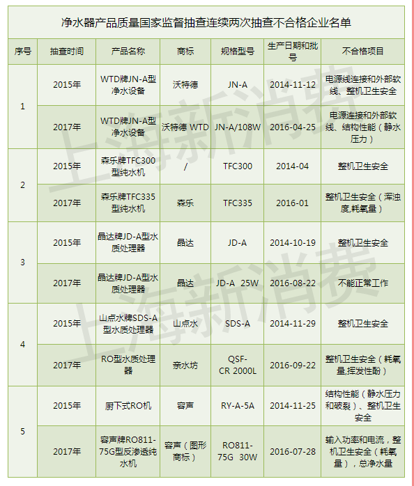 值得關(guān)注的,國家質(zhì)檢總局還披露了在2015年和2017年連續(xù)兩次抽查不合格凈水器企業(yè)名單:森樂凈化技術(shù)(上海)有限公司、北京沃特德環(huán)保設(shè)備有限公司、慈溪市觀海衛(wèi)普吉電器廠、寧波山點水電器有限公司、廣東容聲電器股份有限公司。