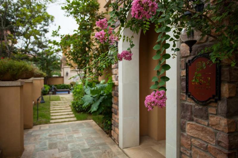 在建筑設(shè)計(jì)上,美式波形瓦、米黃色外立面,配以文化磚和文化石、長廊燈,在日照或陽光的照射下,顯得十分溫馨,給人以溫暖的視覺觀感;在園區(qū)鋪裝材料方面,也是沿襲和借鑒美式建筑元素,如鋪裝時(shí)大量使用美國磚、莆田秀,以自然古樸的色彩打造出符合納帕溪谷的南加州建筑風(fēng)格。