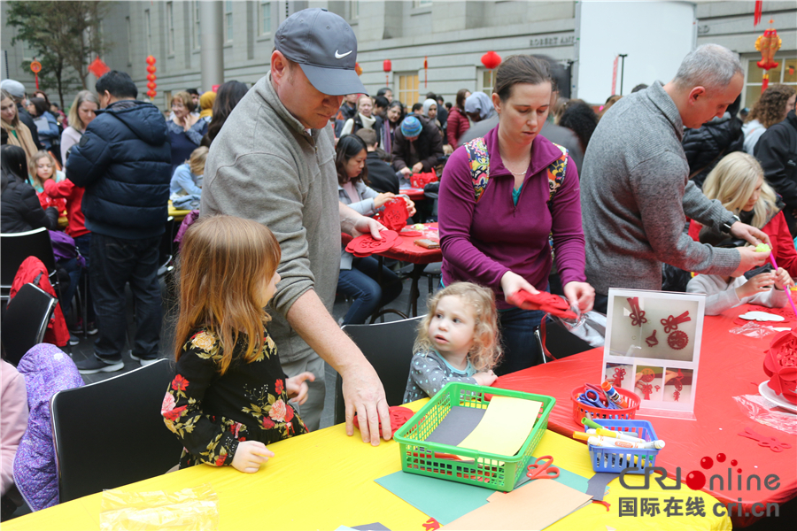 參加當(dāng)日“中國(guó)新年家庭日”的美國(guó)家庭學(xué)習(xí)中國(guó)剪紙藝術(shù)。(攝影:劉坤)