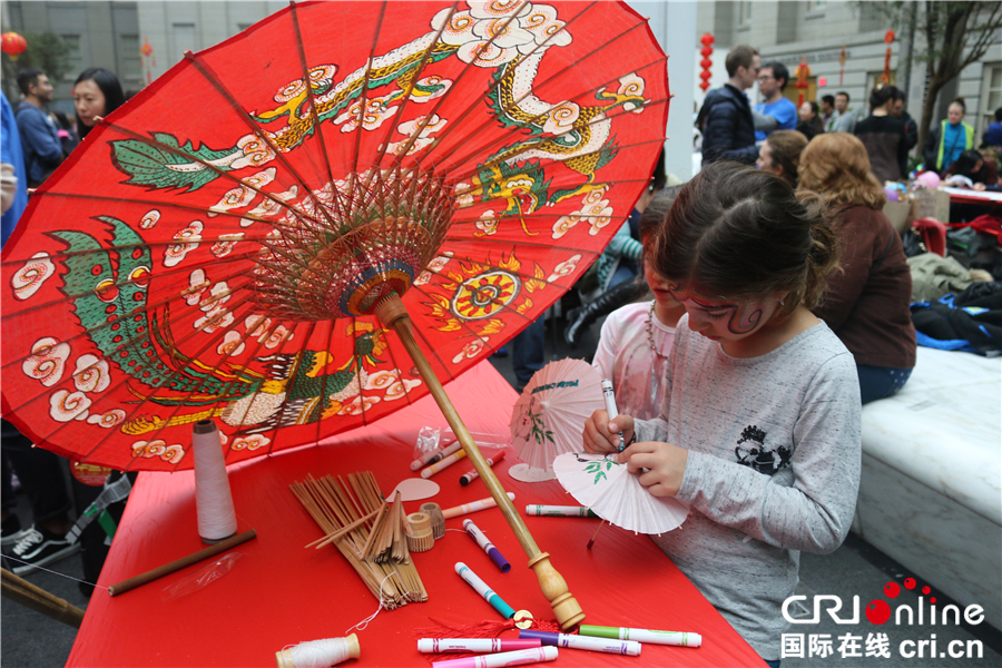 參加當(dāng)日“中國(guó)新年家庭日”的美國(guó)小朋友學(xué)習(xí)手繪紙傘。(攝影:劉坤)