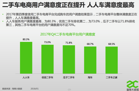 不僅美譽(yù)度問(wèn)鼎行業(yè),在對(duì)已完成購(gòu)車(chē)的用戶(hù)調(diào)查中,人人車(chē)滿(mǎn)意度和口碑更是呈現(xiàn)炸裂現(xiàn)象。在智察大數(shù)據(jù)針對(duì)已完成購(gòu)車(chē)的用戶(hù)調(diào)查結(jié)果顯示,用戶(hù)對(duì)人人車(chē)平臺(tái)的服務(wù)滿(mǎn)意度最高,為80.3%,遠(yuǎn)高于同行業(yè)優(yōu)信二手車(chē)的73%和瓜子二手車(chē)的71.8%。