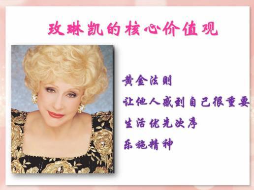 三、玫琳凱的核心價(jià)值觀:黃金法則——你們愿意人怎樣待你們,你們也要怎樣待人;生活優(yōu)先次序——信念第一,家庭第二,事業(yè)第三;樂施精神——不求回報(bào)的幫助他人;讓他人感覺自己很重要