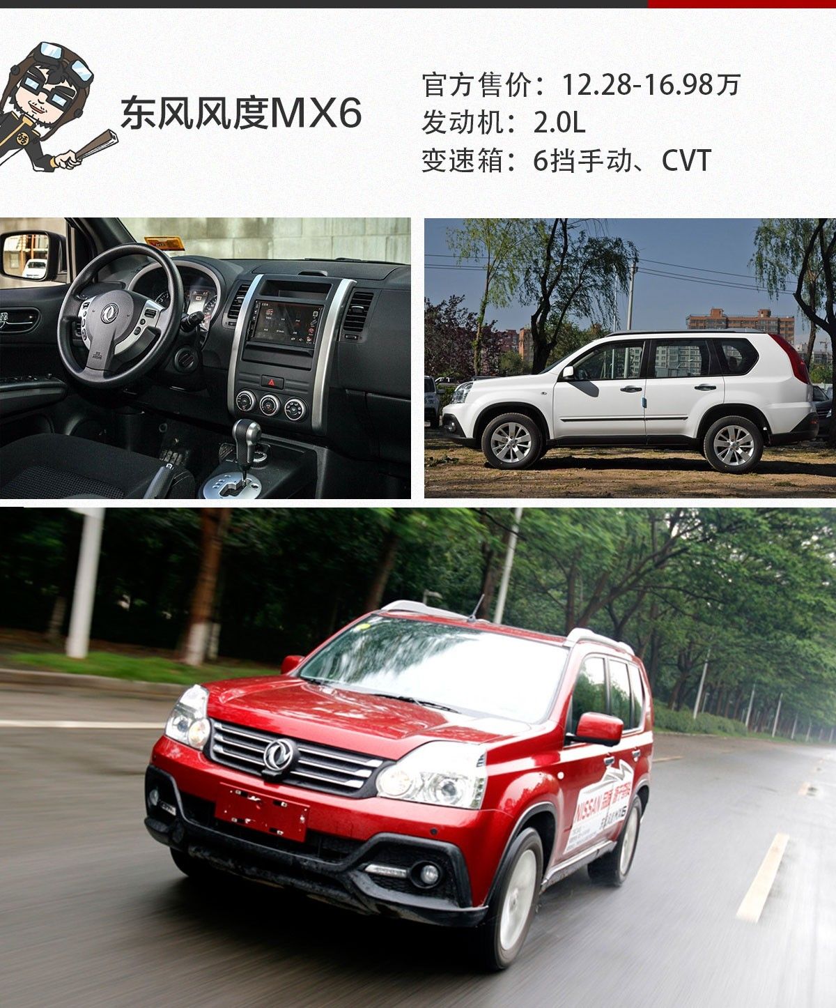 磚叔點(diǎn)評(píng):MX6或許大家不是太熟悉,但日產(chǎn)奇駿大家應(yīng)該都有聽(tīng)說(shuō)過(guò)吧。沒(méi)錯(cuò),風(fēng)度MX6就是基于老款奇駿的平臺(tái)打造而來(lái)的SUV。風(fēng)度MX6全系只有2.0L一款發(fā)動(dòng)機(jī),變速箱匹配6擋手動(dòng)或CVT變速箱。另外配置頗為豐富,全系標(biāo)配無(wú)鑰匙進(jìn)入/啟動(dòng)、倒車(chē)影像、中控大屏、藍(lán)牙電話(huà)、自動(dòng)空調(diào)等。當(dāng)然,價(jià)格也稍微貴點(diǎn)。