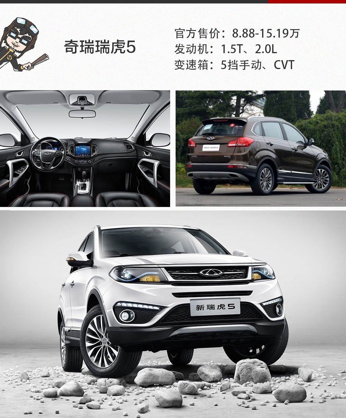 磚叔點(diǎn)評(píng):瑞虎5是奇瑞第一款SUV—瑞虎的繼任車(chē)型,雖然是一款城市SUV,但瑞虎5整體設(shè)計(jì)卻較為“粗獷”,盡管加入了些鍍鉻、亮銀色的裝飾件,但整體看起來(lái)跟其它城市SUV相比還是顯得偏硬派一些。瑞虎5也是全系標(biāo)配車(chē)載藍(lán)牙。