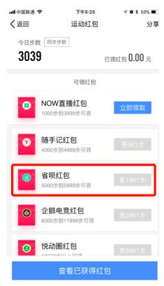 3.達(dá)到5000―5999步即可領(lǐng)取省唄紅包。每日可領(lǐng)一次,金額可以累計(jì)。