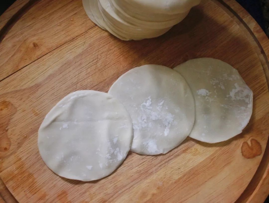 2、將3張餃子皮依次排好,連接處略微重疊,重疊處可抹少量清水。