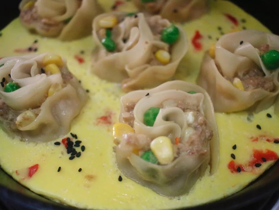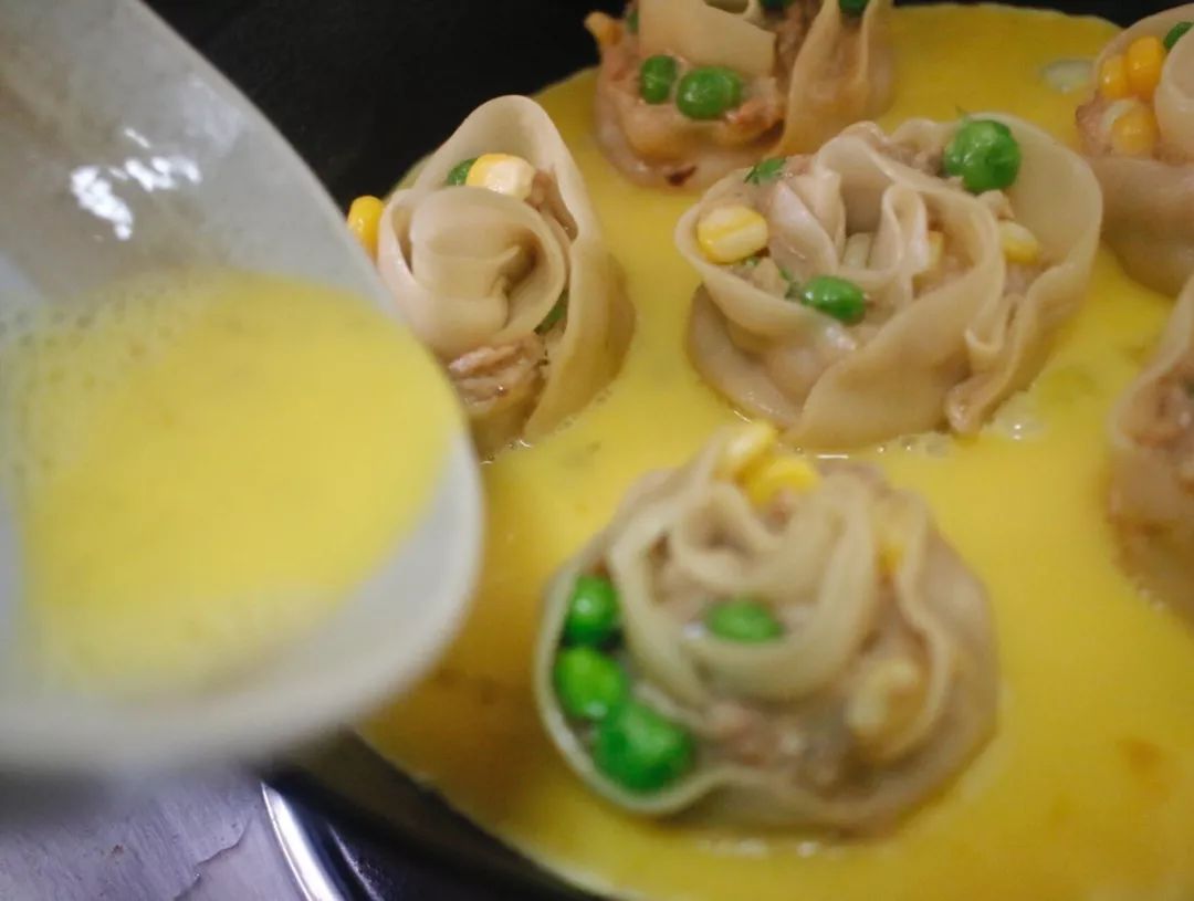 材料:餃子皮(18張)、豬肉糜(200g)、玉米粒(10g)、青豆(10g)、 雞蛋(3顆)