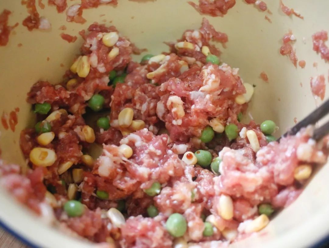 1、往豬肉糜中加入青豆、玉米粒;然后放入生抽、料酒、鹽、糖調(diào)味,攪拌至起勁,備用。