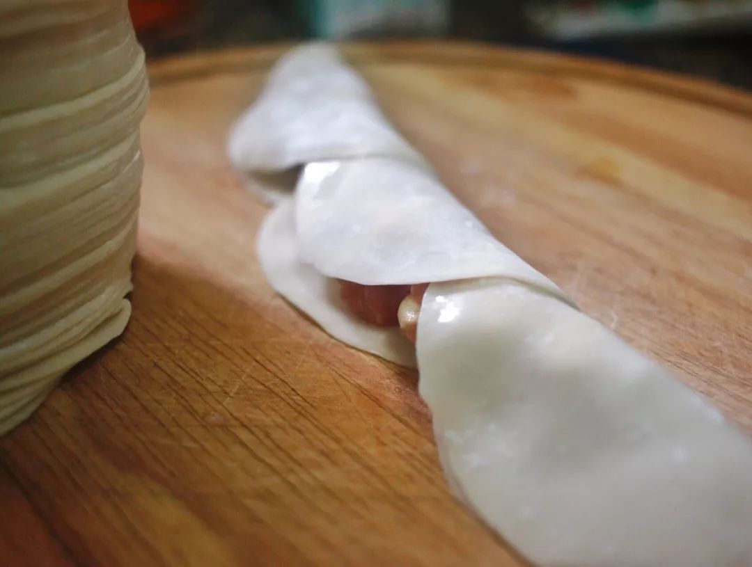 B.餃子皮要先對(duì)折,后再卷起;餡料才能被餃子皮包裹起來(lái)。