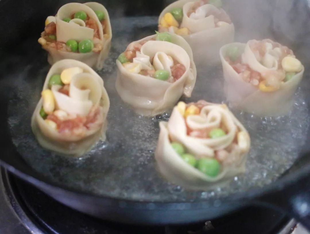 5、取一平底鍋,倒入少許食用油墊底,放入玫瑰花餃子,小火略微香底部,約1分鐘。然后加入莫過(guò)鍋底的清水,加蓋小火燜約8分鐘,直至水收干。