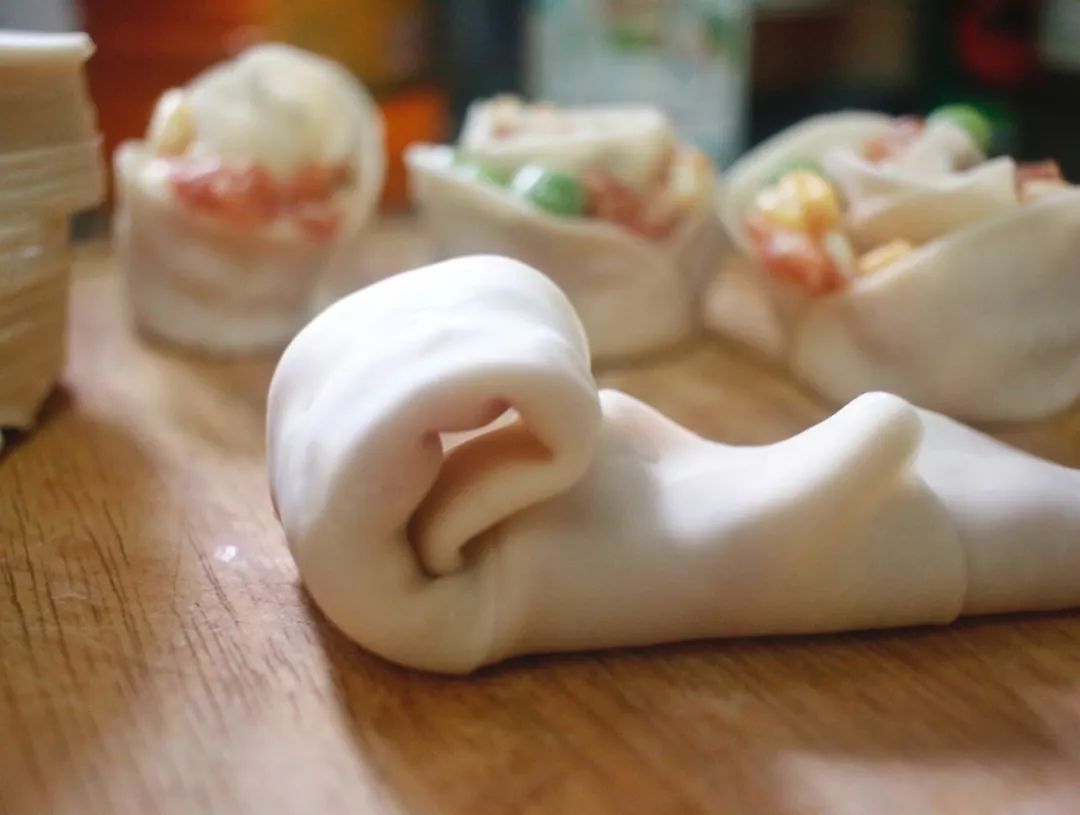 A.肉餡不要放太多,如果玉米粒和青豆粒恰好落在餃子皮重疊結(jié)合處,要往中間撥動(dòng),以免卷起時(shí)餡料被擠壓出來(lái)。